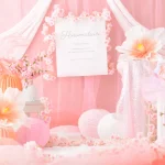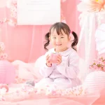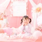 柔らかいピンク色にたくさんのお花やちょうちょを組み合わせてロマンチックなフォトブースをコーディネートしました。性別問わずご参加いただけるので、男の子の撮影も大歓迎です!