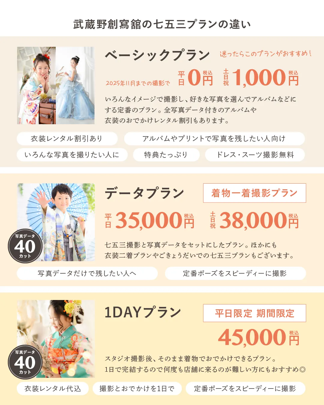 武蔵野創寫舘では七五三プラン3種類ございます。