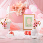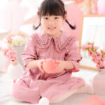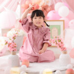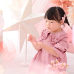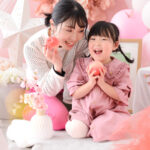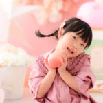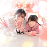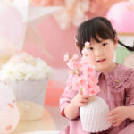 桃色のフォトブースに紙提灯や桃の花などの「ひなまつり」ならではのアイテムをかわいくコーディネートしました。もちろん男の子も大歓迎です!