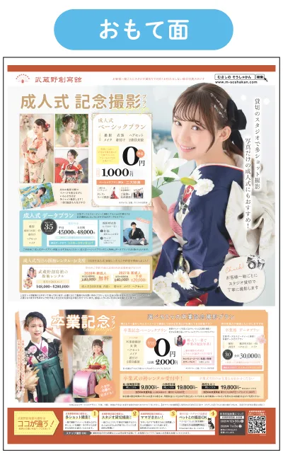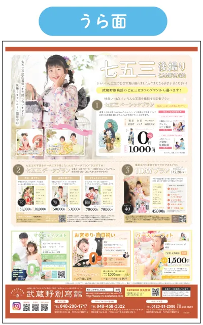 これから七五三の記念撮影をする方に向けて後撮りキャンペーンを開催します。武蔵野創寫舘の七五三プランはご希望の内容に合わせて3つからお選びいただけます、写真データだけのプランや、撮影当日に着物でおでかけできる1DAYプランなどいろんなプランがございます。迷ったらスタッフにお気軽にご相談ください!お話をお伺いしながらお得なプランをご案内いたします。