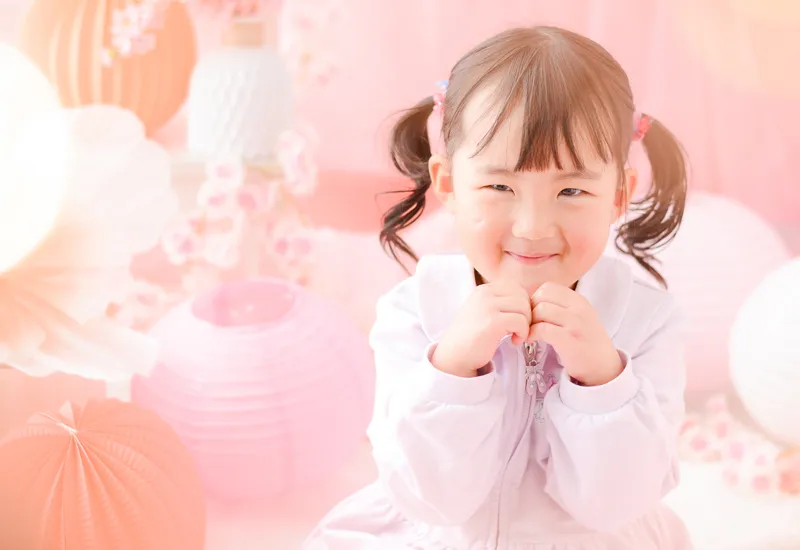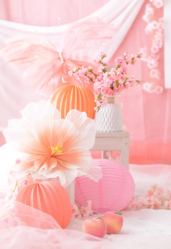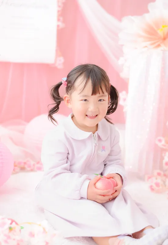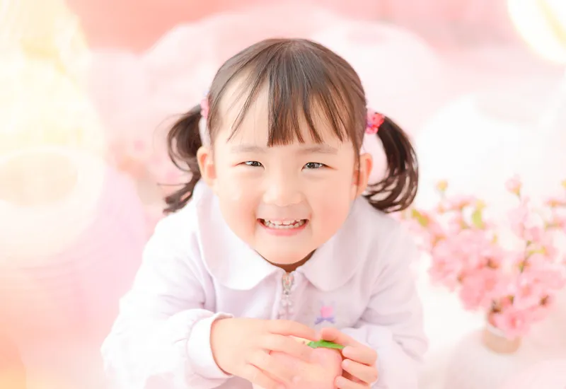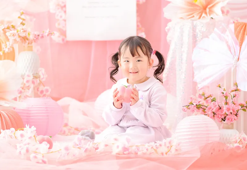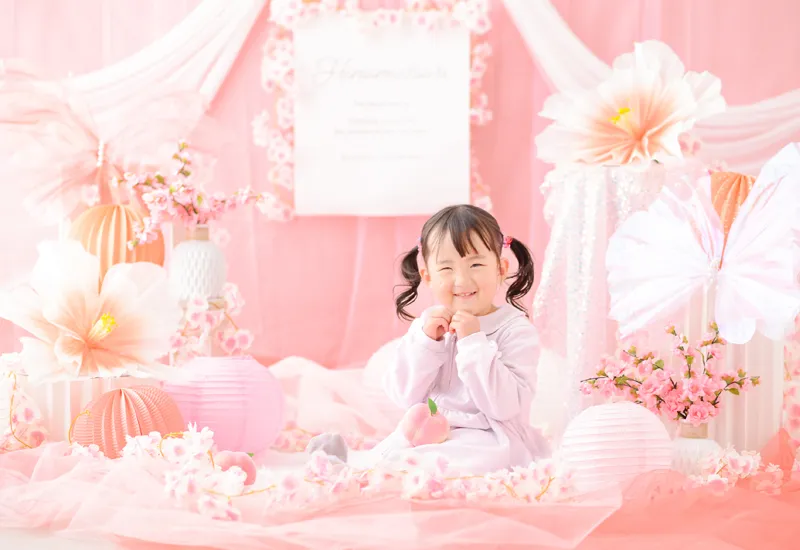 柔らかいピンク色にたくさんのお花やちょうちょを組み合わせてロマンチックなフォトブースをコーディネートしました。性別問わずご参加いただけるので、男の子の撮影も大歓迎です!