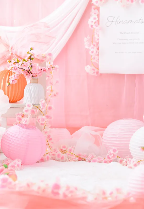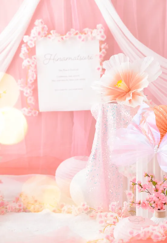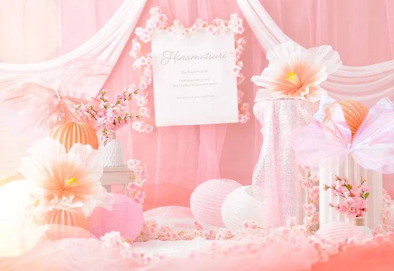“ひなまつり”をテーマにたくさんのお花とピンク色のモチーフでロマンチックなフォトブースを作りました。