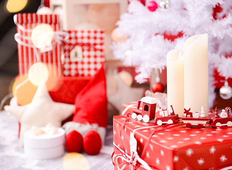 クリスマスツリーやたくさんのプレゼントに囲まれて、ワクワク感いっぱい!