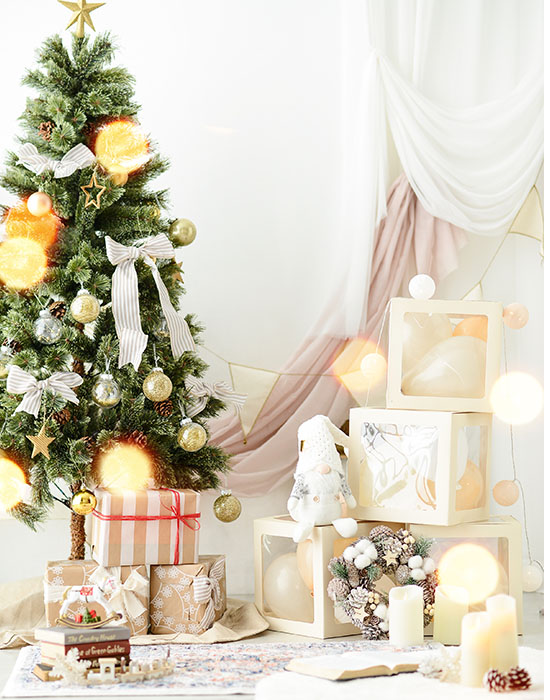 白いモコモコのクッション。サンタクロース。たくさんのプレゼントボックスとツリーに囲まれて