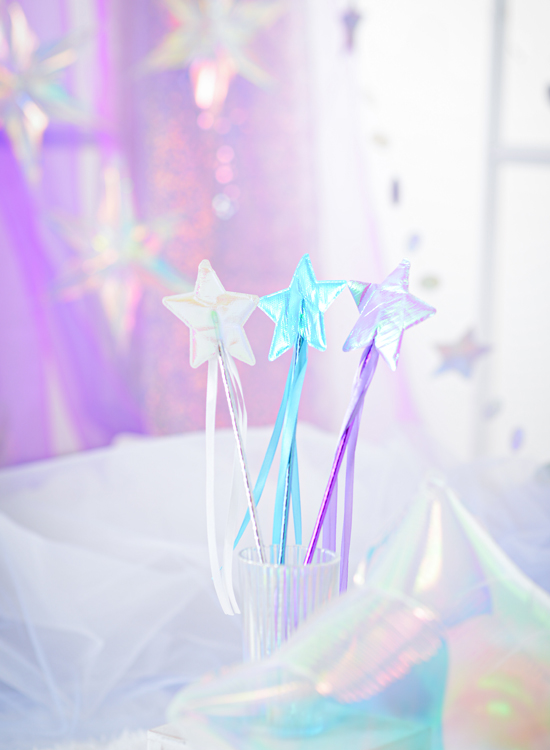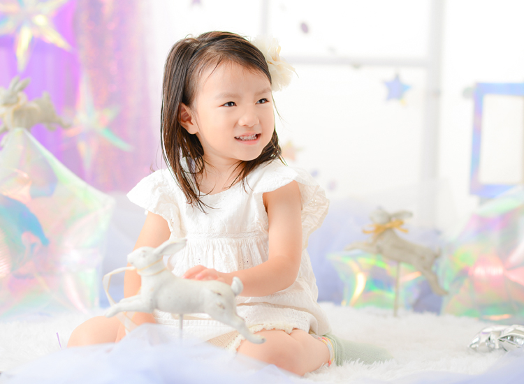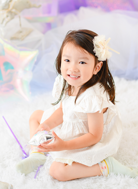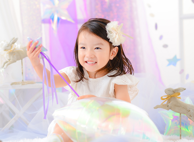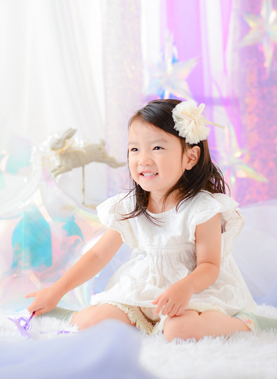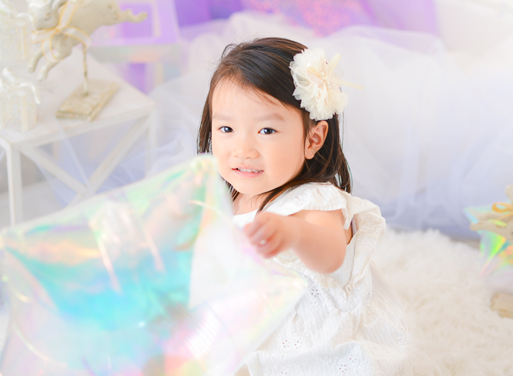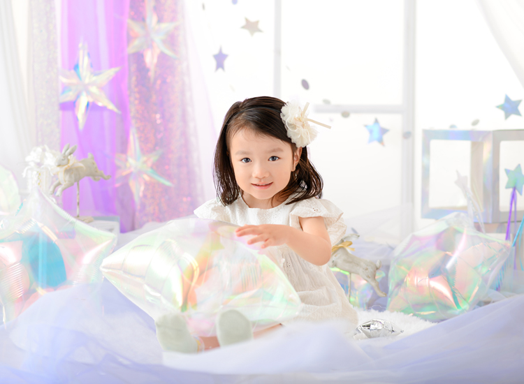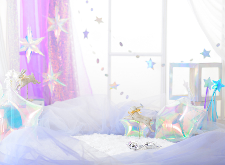 オーロラバルーンなど、キラキラした小物をいっぱい集めてドリーミーなフォトブースを作りました。まるで雲の上のような”夢かわ”な空間で今だけの記念写真を撮影します。